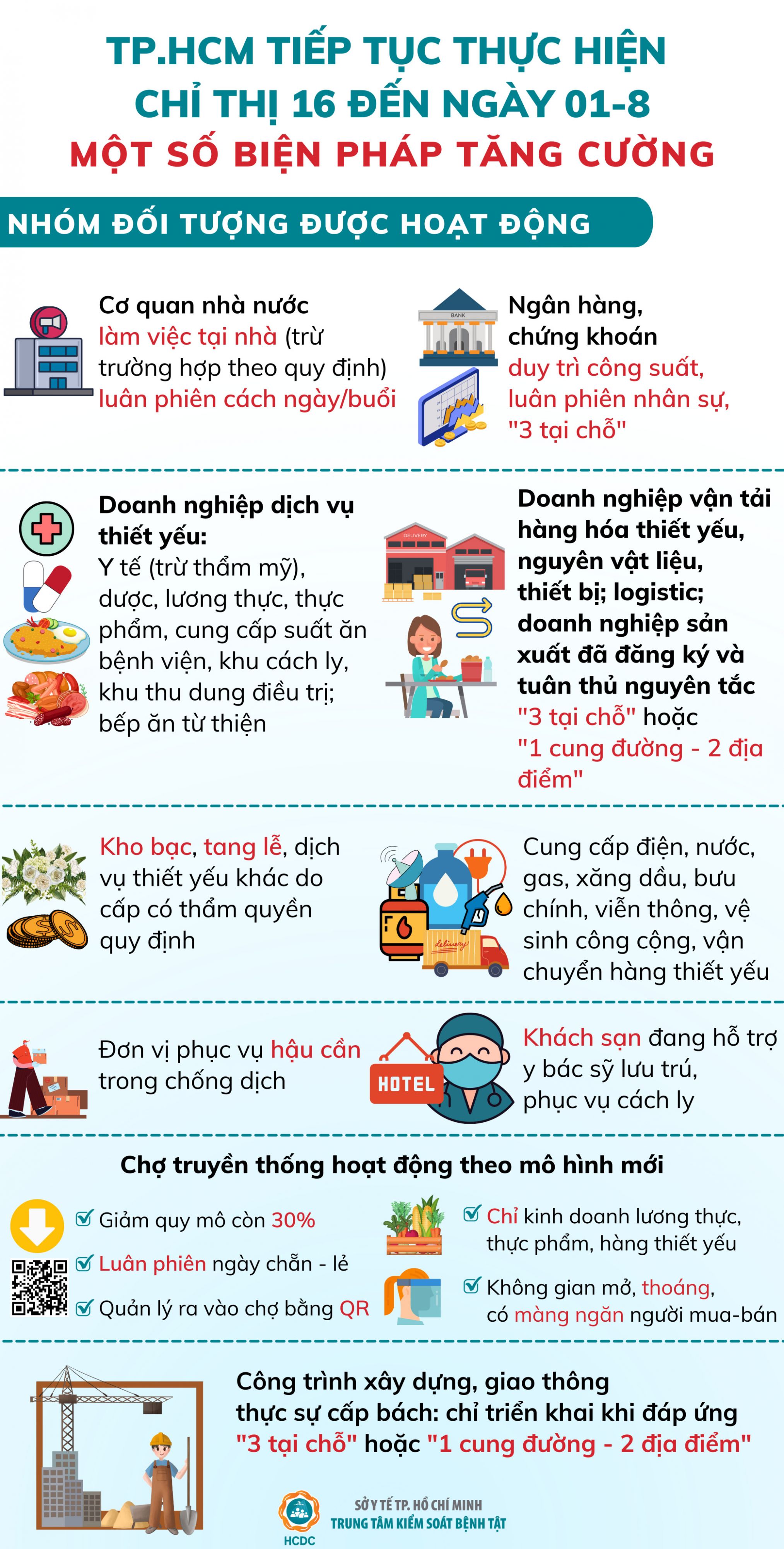 Trước tình hình cấp bách do chủng vi-rút mới Delta diễn biến nhanh, mạnh, khó lường, để thực hiện bằng được mục tiêu bảo vệ tính mạng, sức khỏe của người dân TP, ngăn chặn số ca nhiễm mới, hạn chế tối đa trường hợp tử vong, bảo vệ hệ thống y tế và khả năng điều trị, cứu chữa bệnh nhân, TP.HCM tiếp tục thực hiện giãn cách xã hội theo Chỉ thị 16 của Thủ tướng Chính phủ từ 0 giờ ngày 24/7 đến hết ngày 01/8 và tăng cường thêm một số biện pháp. Bảo đảm giãn cách giữa cá nhân với cá nhân, gia đình với gia đình; thực hiện nghiêm quy định tại các khu cách ly, khu phong tỏa.