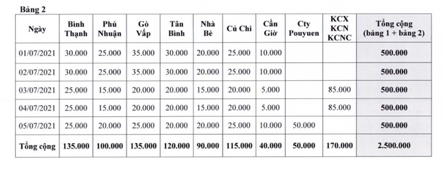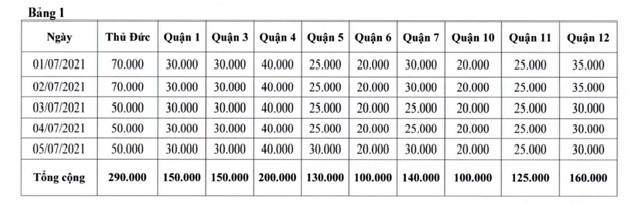Theo đó, hoạt động lấy mẫu dự kiến được thực hiện từ ngày 26/6 đến ngày 30/6 tại Quận 8, quận Bình Tân, quận Tân Phú, huyện Bình Chánh, huyện Hóc Môn và từ ngày 01/7 đến ngày 05/7 tại thành phố Thủ Đức và các quận huyện còn lại, theo phương pháp lấy mẫu gộp 10, gộp 15 với số lượng 500.000 người/ngày.