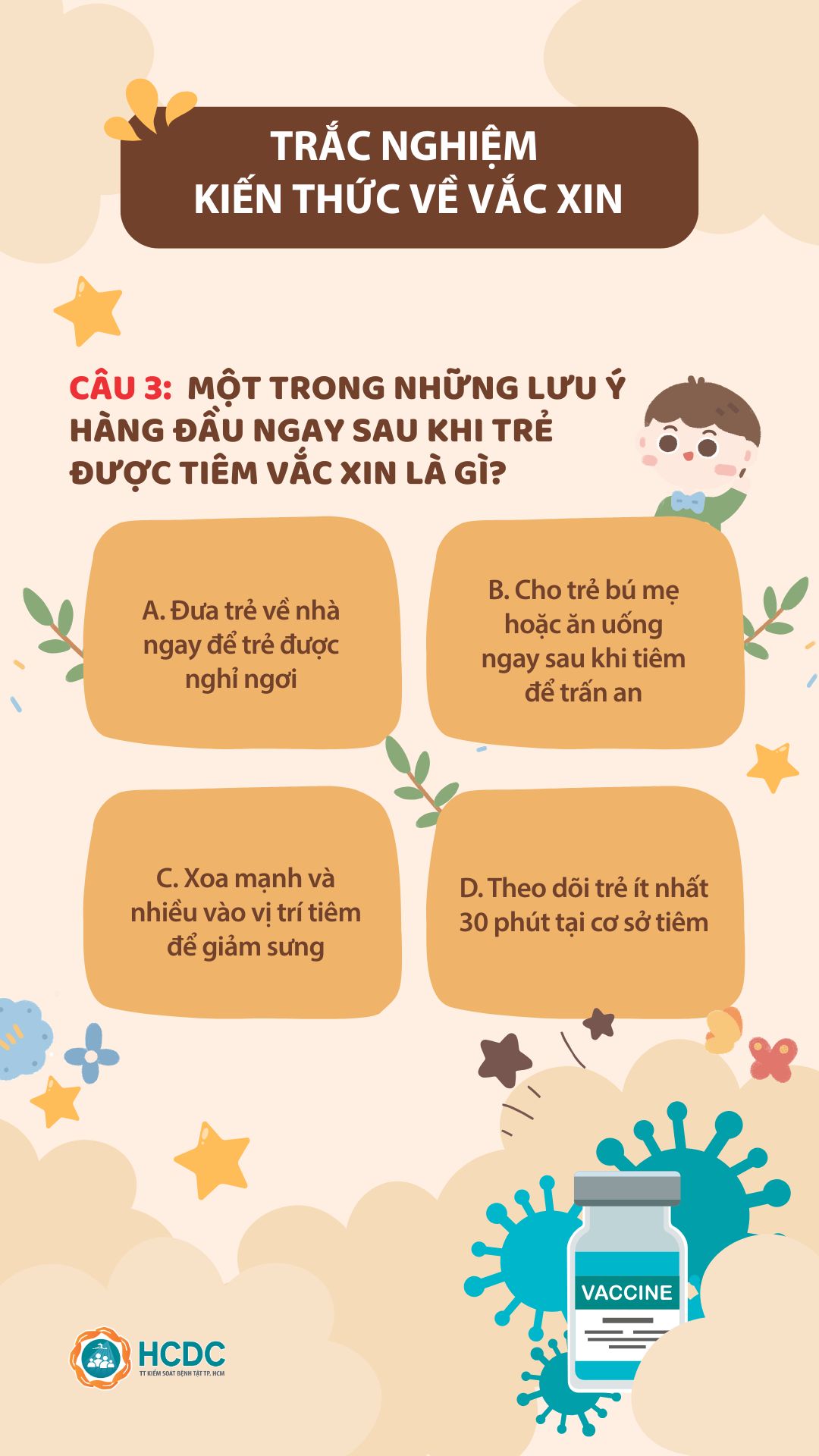 Câu 3: Một trong những lưu ý hàng đầu ngay sau khi trẻ được tiêm vắc xin là gì?