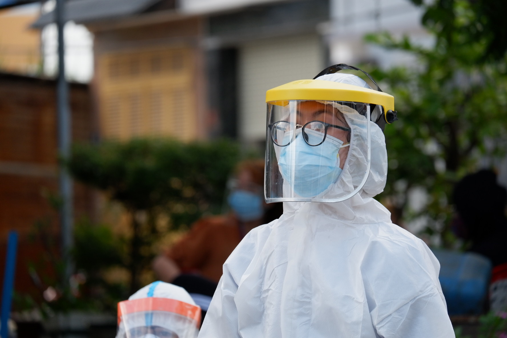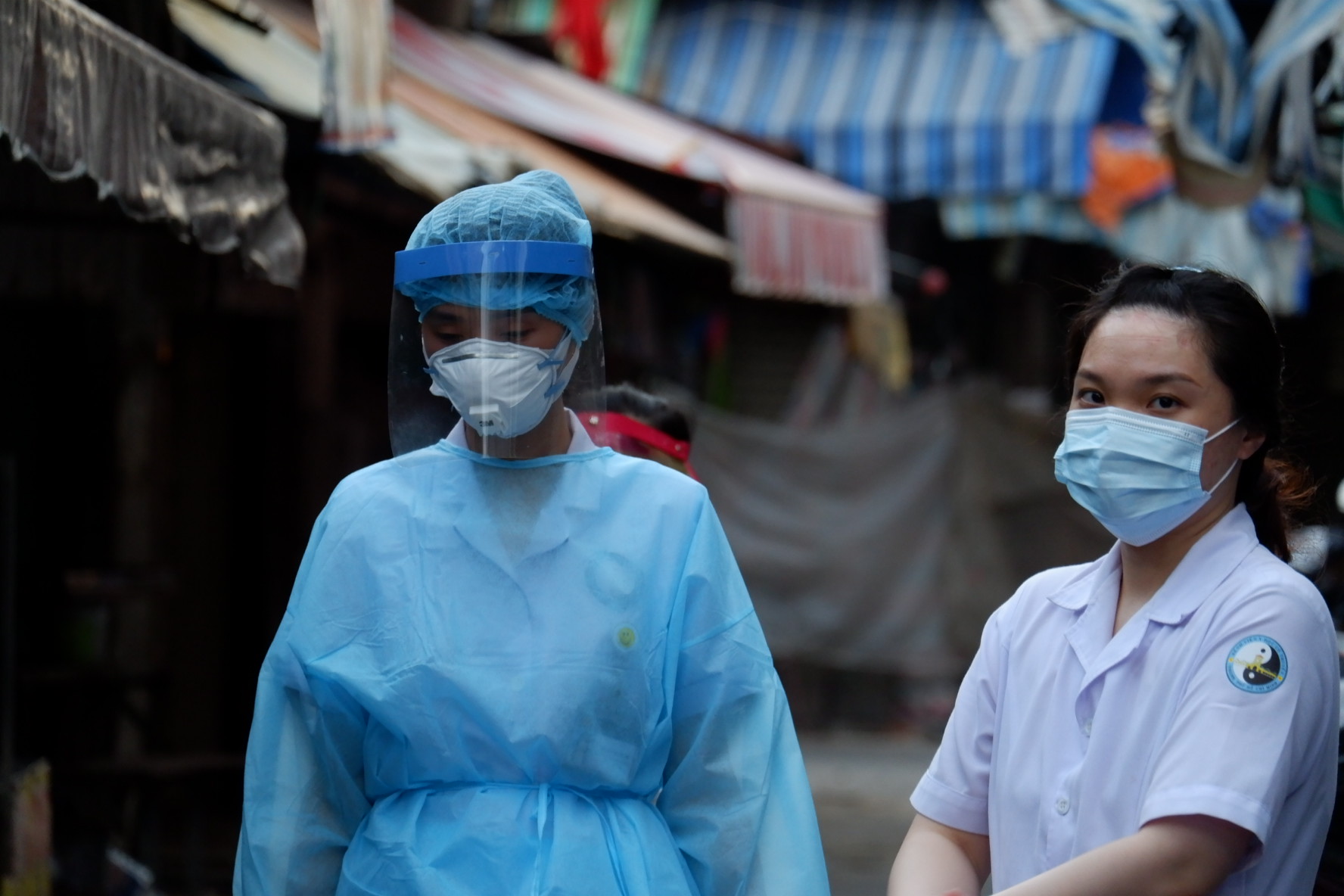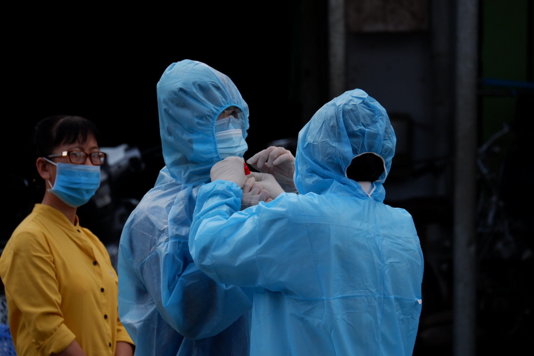 Hình ảnh thấm mệt của một kỹ thuật viên lấy mẫu xét nghiệm tại Chợ khu phố 2, phường An Lạc, quận Bình Tân.
