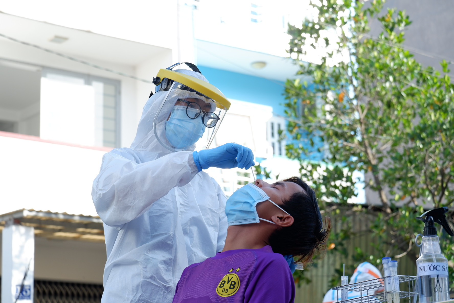 Kỹ thuật viên lấy mẫu xét nghiệm của bệnh viện Da Liễu nhận nhiệm vụ tại một khu dân cư đường Hồ Học Lãm, phường An Lạc, quận Bình Tân